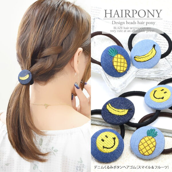 商品名 デニムくるみボタンヘアゴム(スマイル&フルーツ) (DPY-380-009) STAFFコメント 定番人気のデニム風生地にスマイルやフルーツなどの可愛いモチーフが刺繍されたヘアゴム! カジュアルなファッションなどデイリーに使えるヘアアクセです。